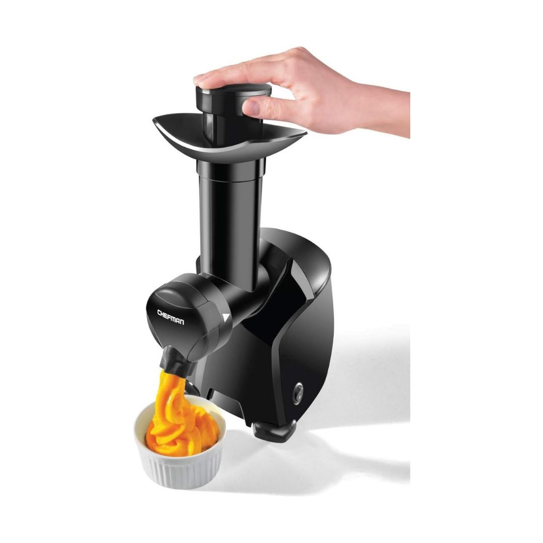 Pour fabriquer votre crème glacée avec la Chefman Frozurt, voici comment procéder : sortez des fruits congelés (de votre choix) du congélateur. Patientez jusqu’à ce qu’ils aient dégelé tout en restant froids. Puis, placez-les dans la goulotte et pressez. Votre crème est immédiatement disponible.