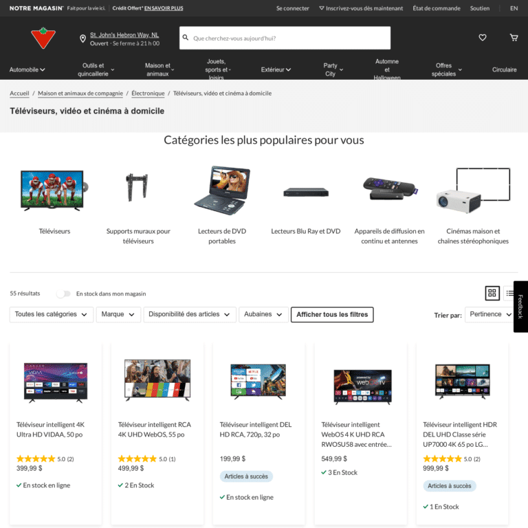 Concernant les téléviseurs, une large sélection d’écrans plats, de télé 4K et 8K ultra HD, sont disponibles sur le site pour acheter une TV au Québec.