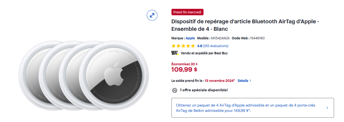 Si tu cherches une solution simple pour garder un œil sur tes objets précieux, l’AirTag d’Apple est là pour t’aider, et en ce moment, tu peux mettre la main sur un ensemble de 4 AirTags pour seulement 109,99 $! 📉