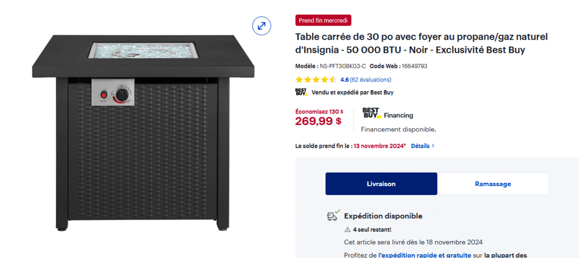Envie de profiter des soirées fraîches avec style et confort? La table avec foyer au propane de 30 po d’Insignia est là pour réchauffer l’ambiance, et elle est actuellement offerte à un prix record! 🔥💥