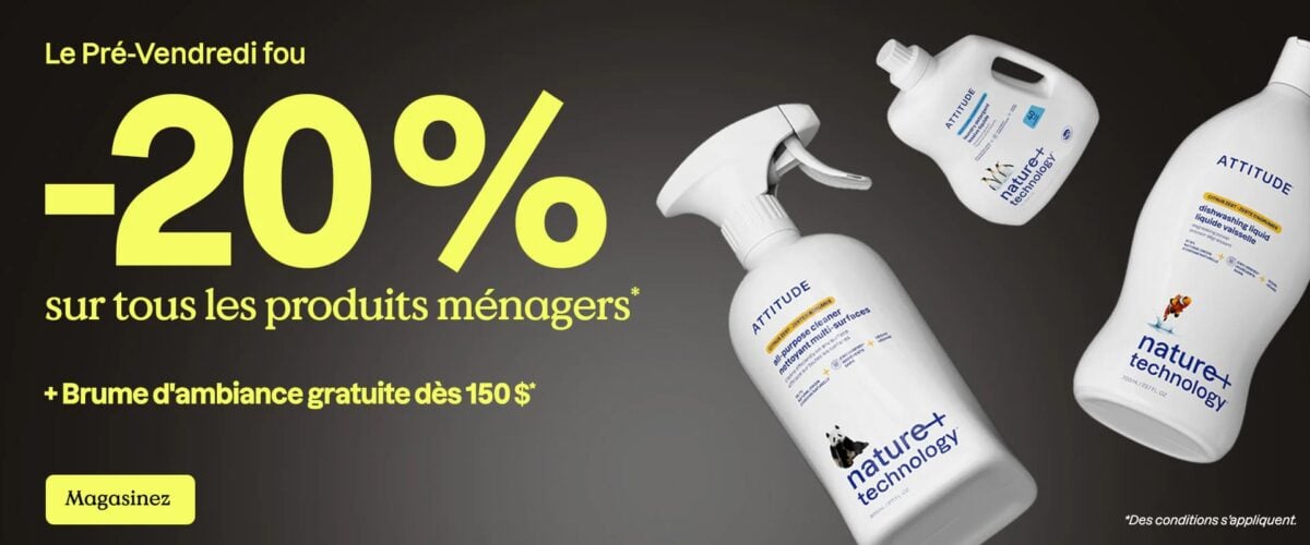 C’est ta dernière chance de remplir ta salle de bain (et ton garde-manger écolo) à pas cher avec des produits ATTITUDE, fabriqués au Québec, véganes, sans cruauté et sans plastique à usage unique.